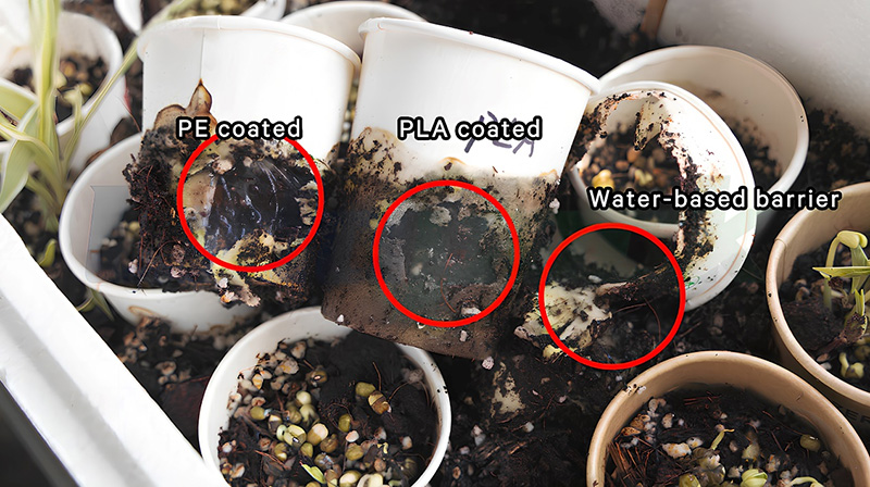 ప్రయోగాత్మక తీర్మానం: అధిక నుండి తక్కువ వరకు అధోకరణం డిగ్రీ సజల చెట్లతో కూడిన కాగితపు కప్> ప్లా> పిఇ.